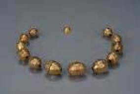 "Il s'agit du procédé de soudure par diffusion du cuivre. cette méthode a pu être décelée par une étude au microscope électronique à balayage. La composition des perles présente une forte teneur en argent (près de 35%), alors que celle du cuivre n'est en moyenne que de 1,5% (et près de 2% au niveau de la jonction des coques). Ces perles sont constituées chacune de deux coques d'or embouties, décorées à la fois de motifs ciselés et repoussés. La longueur des perles varie de 1,6 à 2,5 cm et leur poids de 2 a 4,4 g, le poids total étant de 37 g."